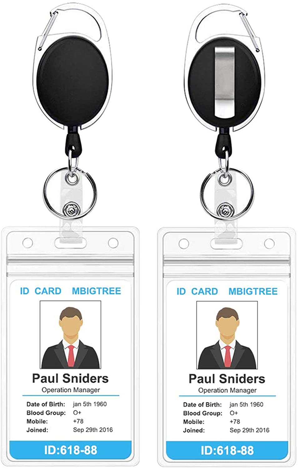 2 Pack Heavy Duty Retractable Badge Holders with Carabiner Reel Clip and Vertical Style Clear ID Card Holders, 24 inches Thick Pull Cord