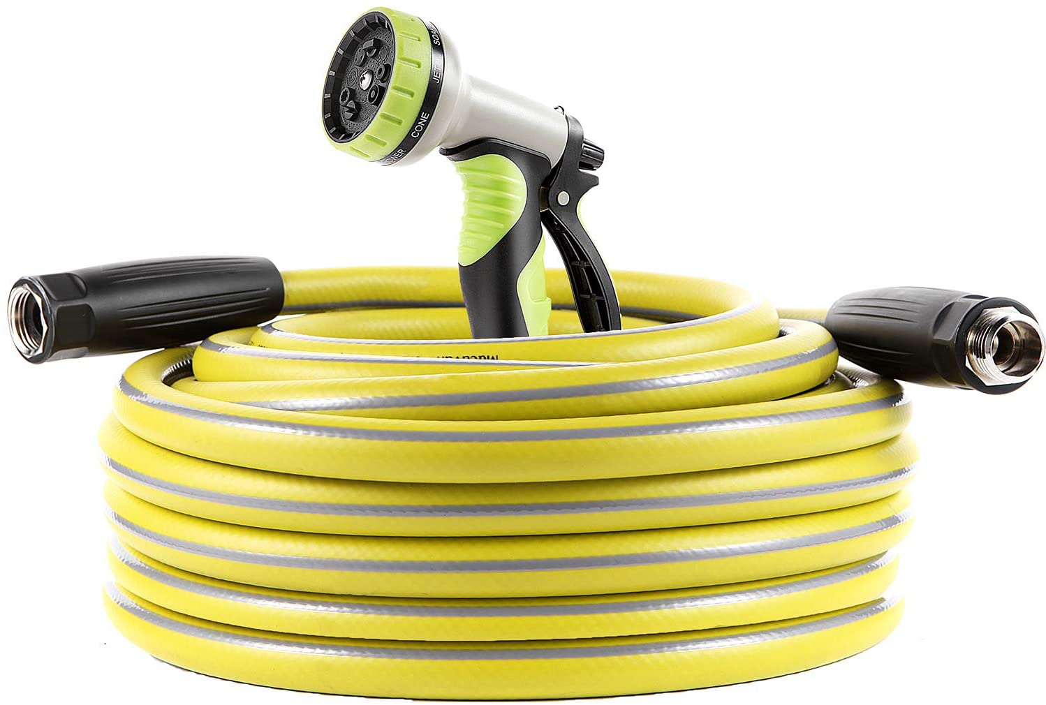 Garden Hose 100 ft Heavy Duty-Water Hose with 9 Way Spray Nozzle and Flexible 4 Layers Hybrid-3/4 Nickel Plated Brass Fittings-5/8