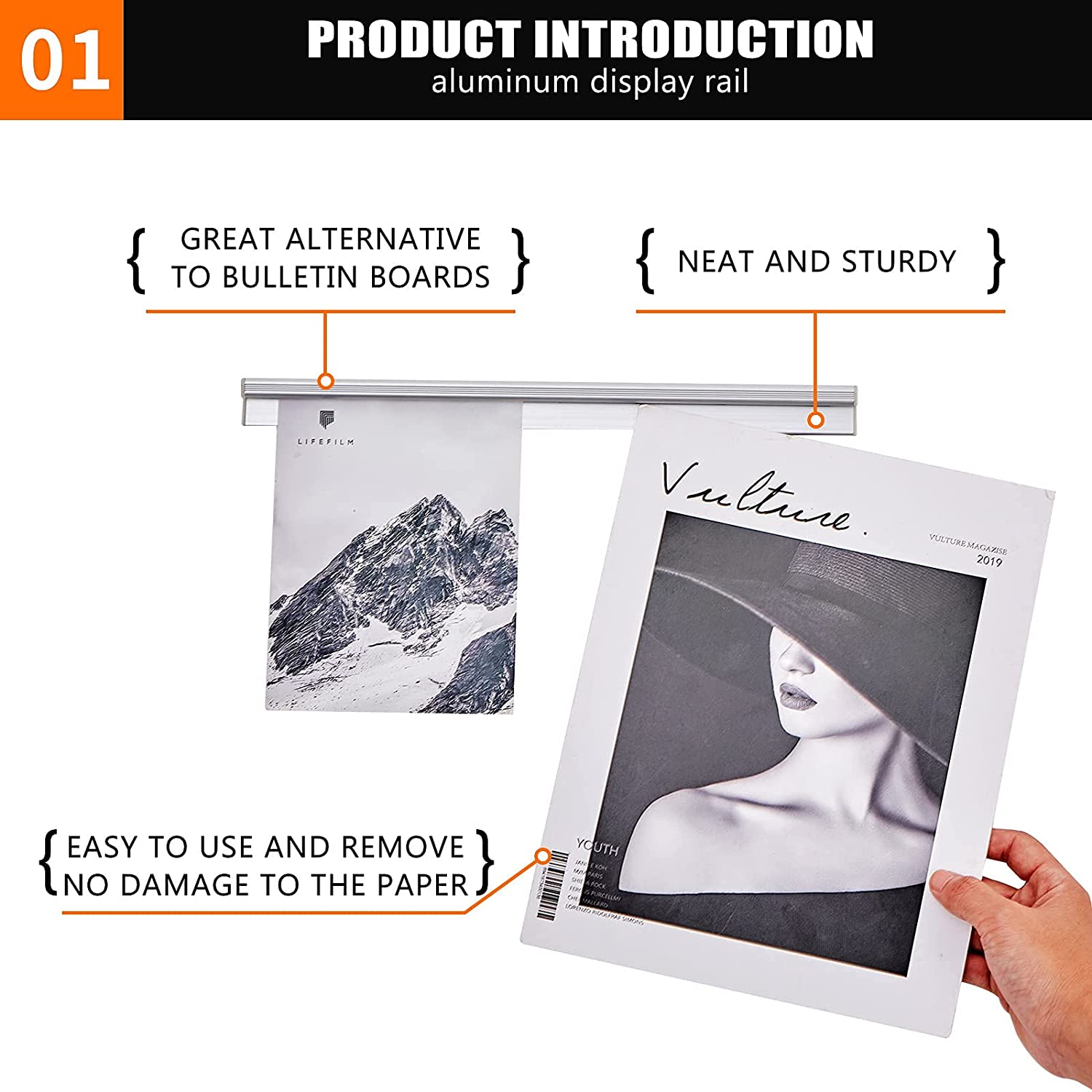 1. EASY TO USE AND REMOVE: The roller system can hold the papers snugly as long as you slide them into the holder. By lifting and pulling, you can remove them easily. No pin, no tack, no nail, no glue but nice display!